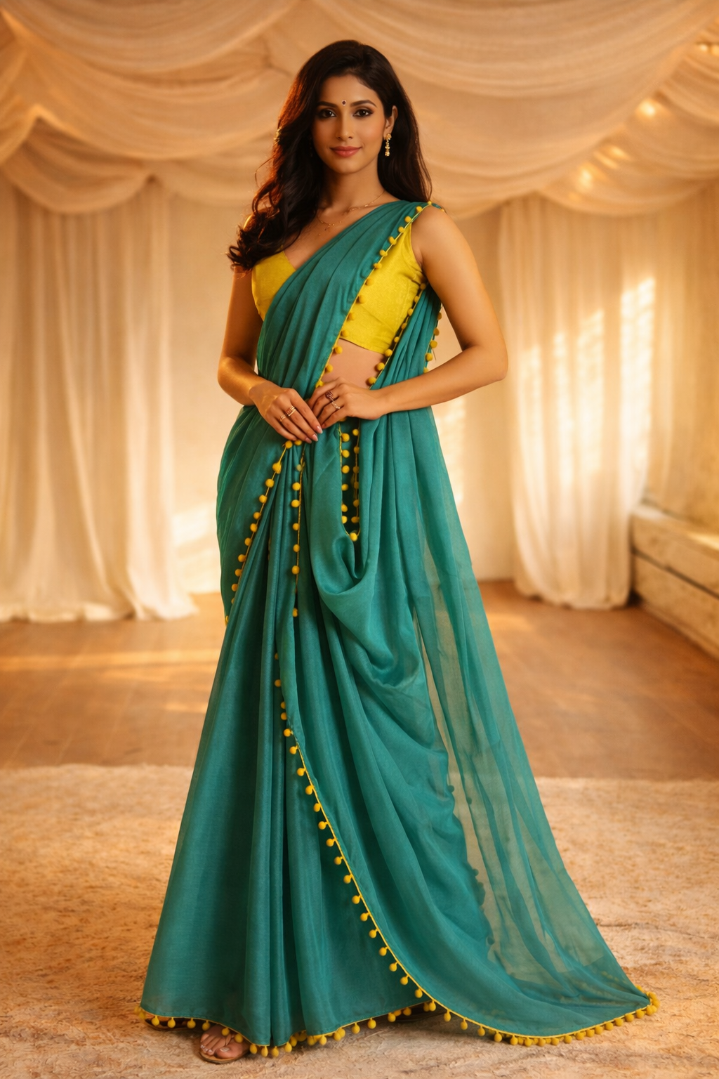 - Fabric: Made from finely woven silk threads, giving a light, sheer, and airy texture.