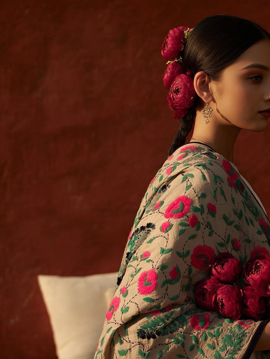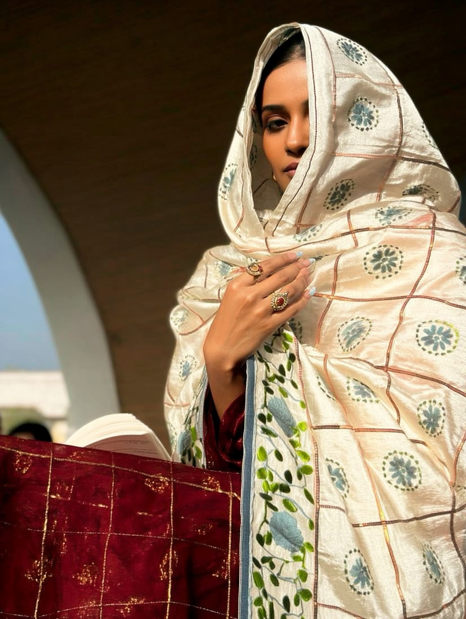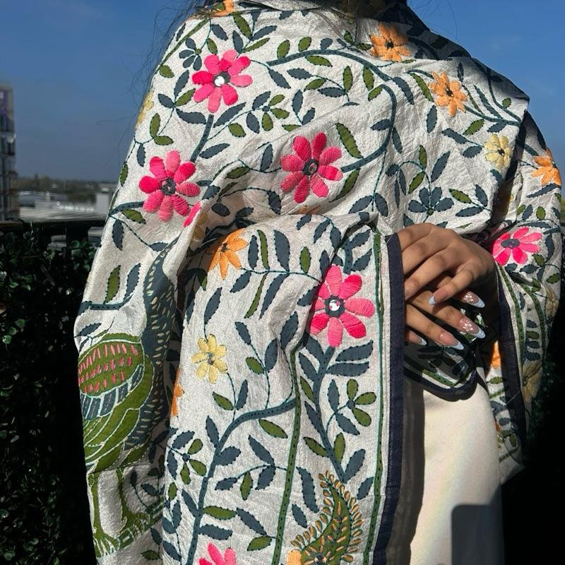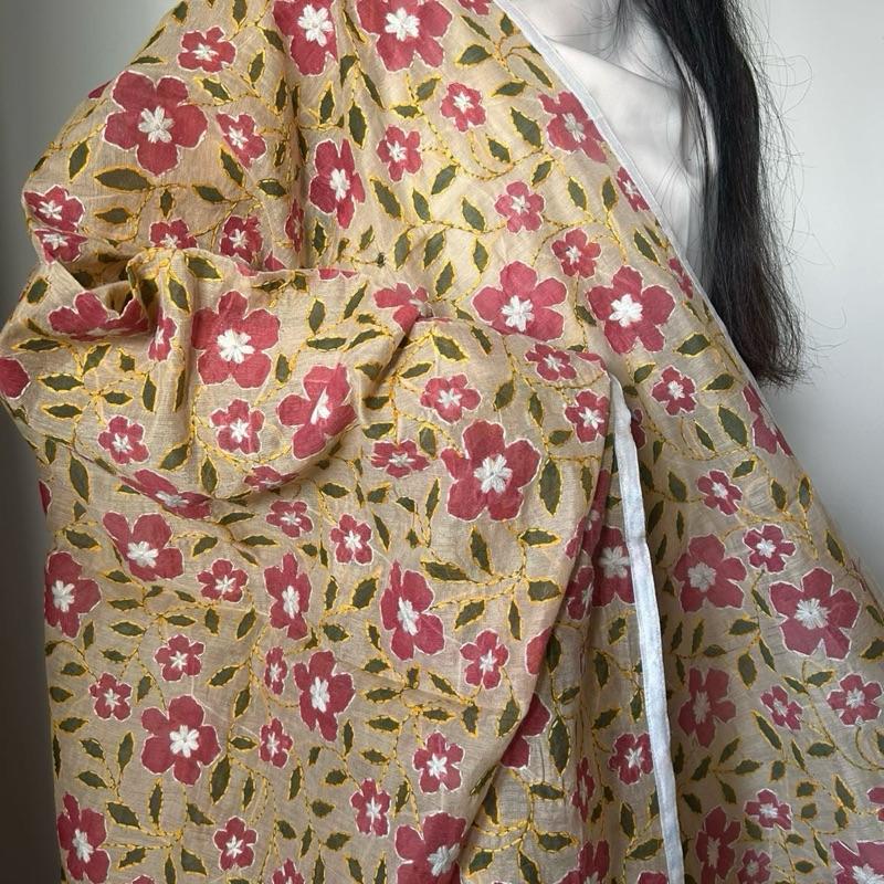 - Design: Features detailed depictions of peacocks, doli scenes, lush fields, and birds – each symbol woven with cultural meaning and significance. These designs of our Chanderi Silk Phulkari Dupatta is a classic accessory. It features a simple yet elegant phulkari pattern. This dupatta is crafted from Chanderi silk, offering a touch of sophistication. Perfect for adding a subtle flair to any outfit.