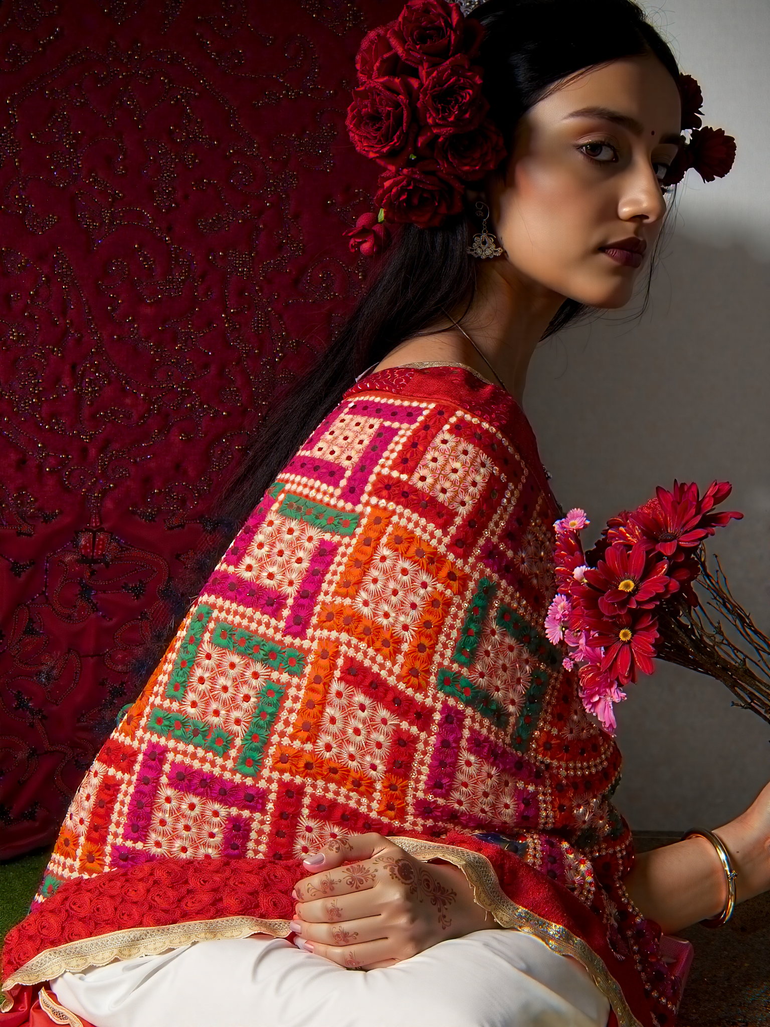 A Punjabi bride’s outfit would often include a heavily embroidered Phulkari, made by mothers, grandmothers, or women in the family. Some brides wore them during pre-wedding rituals, while others received them as part of their shagan (blessings and gifts from elders). The richness of the embroidery is a symbol of love, prosperity, and the effort of the women who make it. These dupattas hold immense emotional and cultural meaning. They are a reminder of home, family and the support system we have as women.